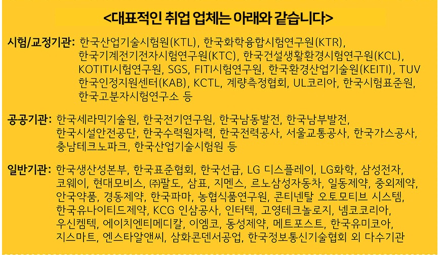 주요 취업분야는 교육과정 연관분야인 품질관리 및 보증(QM/QC, 시험/교정/검사 기관 연구원, 안전 및 위생관리자, 인증기관 및 관련부서 등으로 취업하고 있습니다.